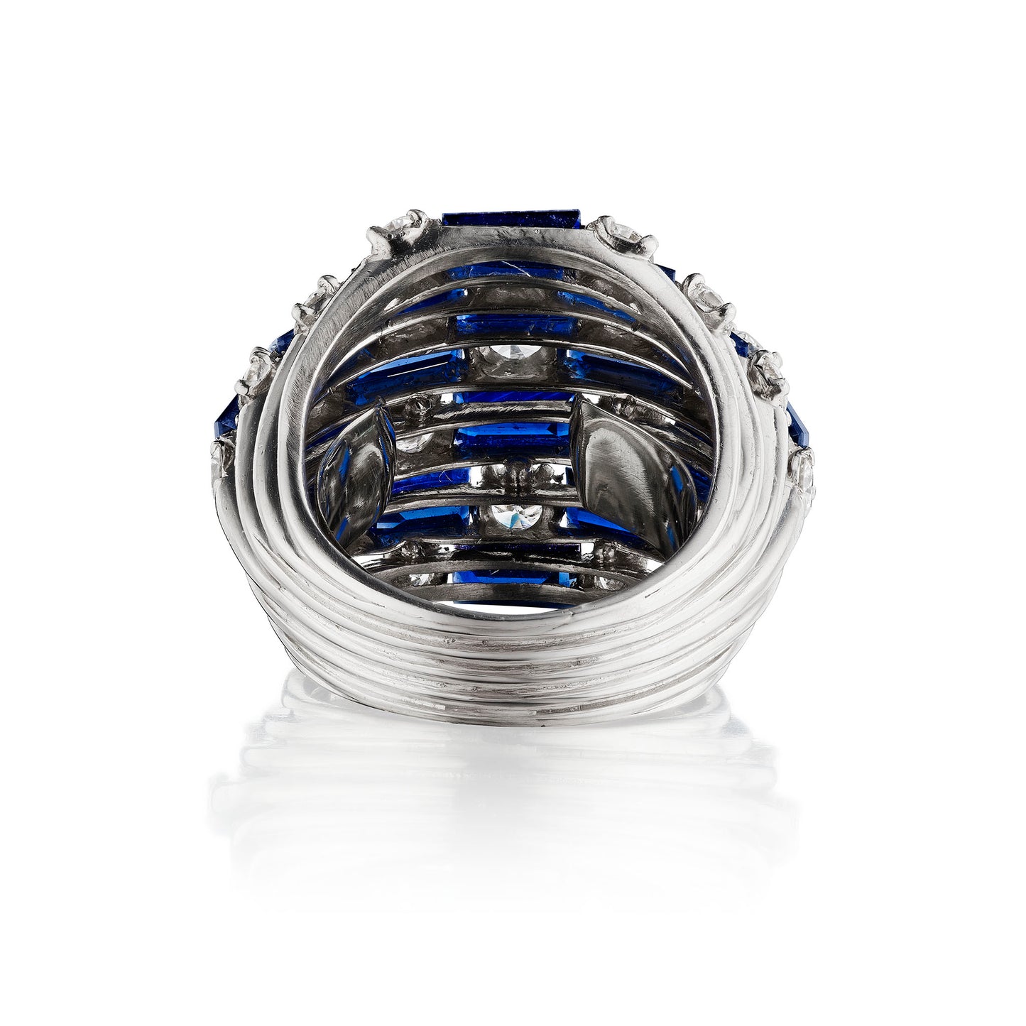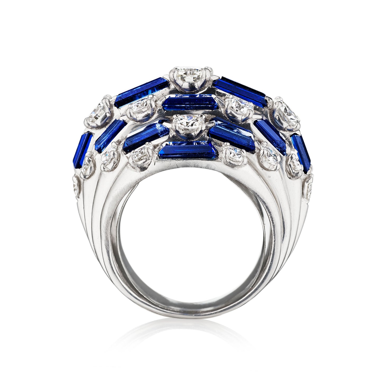 Materials: 16 baguette sapphires (total weight 4.86 carats); 23 round diamonds (total weight 1.99 carats); Platinum