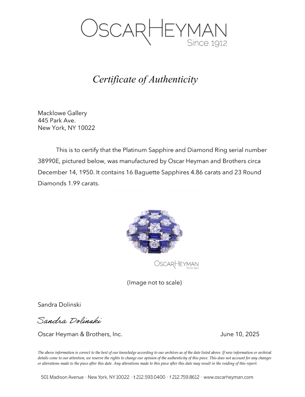 Documentation: The ring is accompanied by a photo-illustrated certificate of authenticity from Oscar Heyman, dated June 10, 2025, stating that the ring is serial no. 38990E, and specifying gem weights and date of manufacture.
