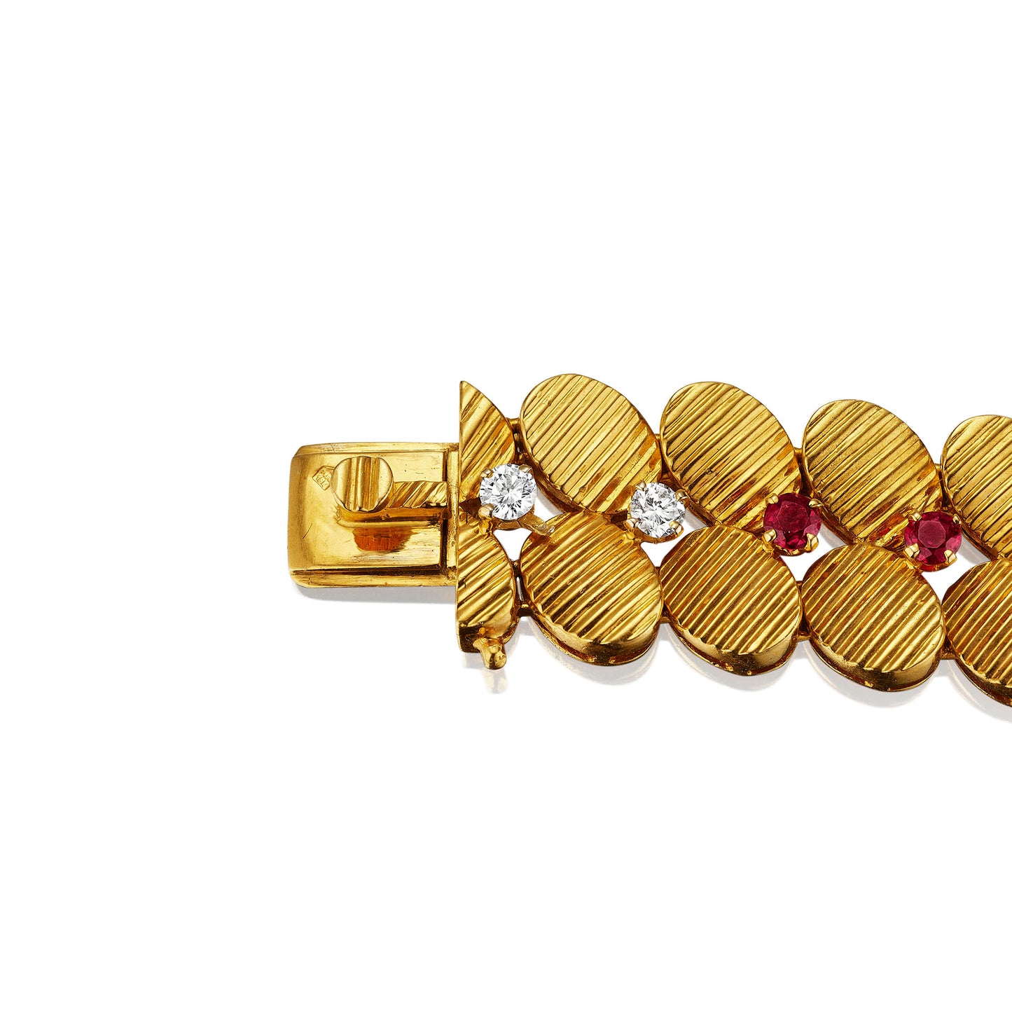 Created in the 1960s by Péry & Fils, Paris, and retailed by Gübelin, this mid-century ruby and diamond necklace and bracelet are set in 18K gold. The strap bracelet and slightly graduating necklace are both designed as ribbed, leaf-form links mounted with pairs of round brilliant-cut diamonds alternating with rubies. This suite is an example of refined mid-century jewelry - everyday, simple motifs and forms uplifted by streamlined design and exceptional Parisian workmanship.