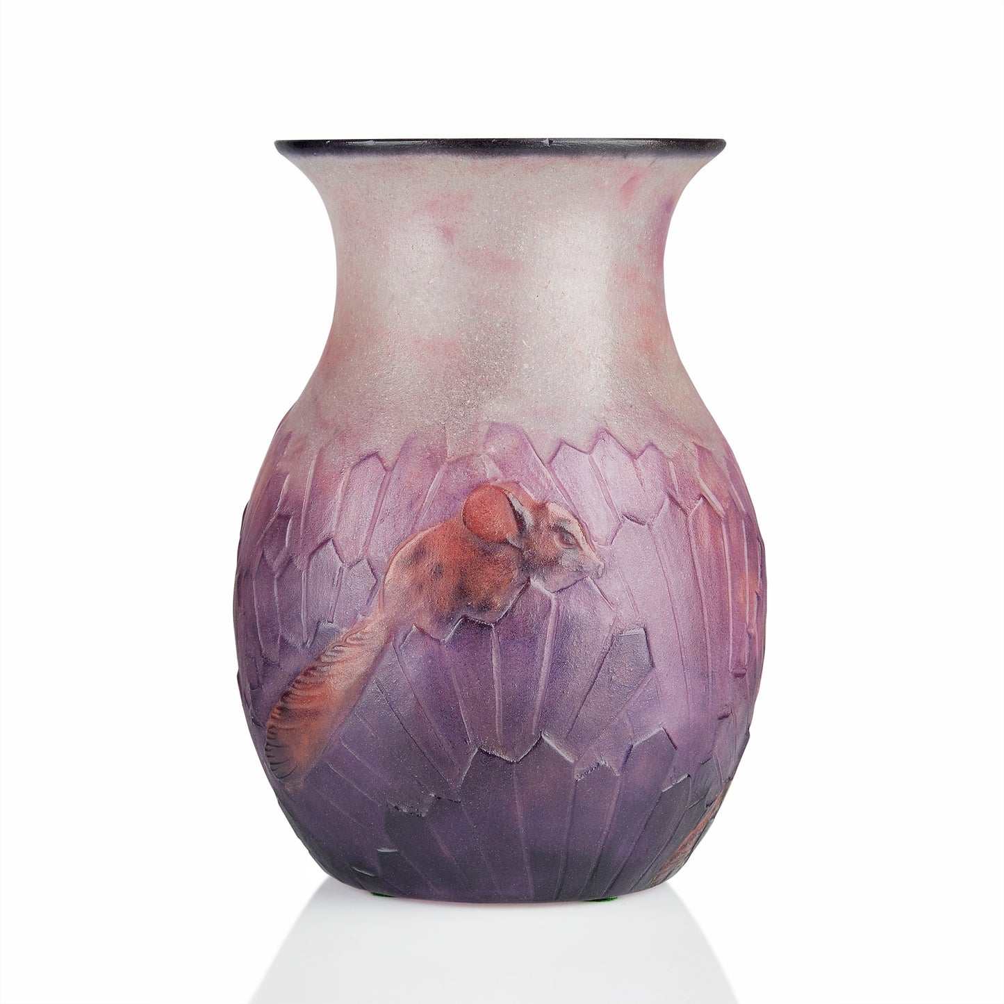 This French "Ecureuils dans l'herbe," or "Squirrels in the grass" pâte de verre vase by Gabriel Argy-Rousseau is exquisitely executed entirely in a palette of warm reds, pinks, and purples, features a soft, innocently postured squirrel climbing through architectural foliage that takes the form of many obelisks arranged in swathes to resemble deconstructed palm fronds.