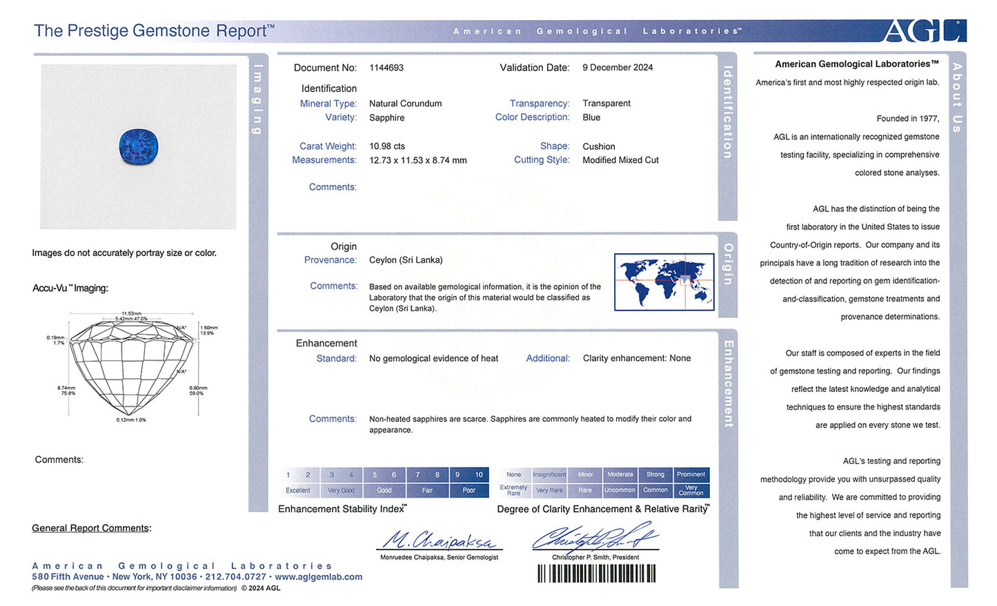 Documentation: Accompanied by American Gemological Laboratories (AGL) report 1144693 dated 9 December 2024 stating that the sapphire is Ceylon (Sri Lanka), with no evidence of heat, and by Swiss Gemmological Institute (SSEF) report no. 114828 dated 13 October 2020 stating that the stone is of Ceylon (Sri Lanka) origin, no indications of heating.