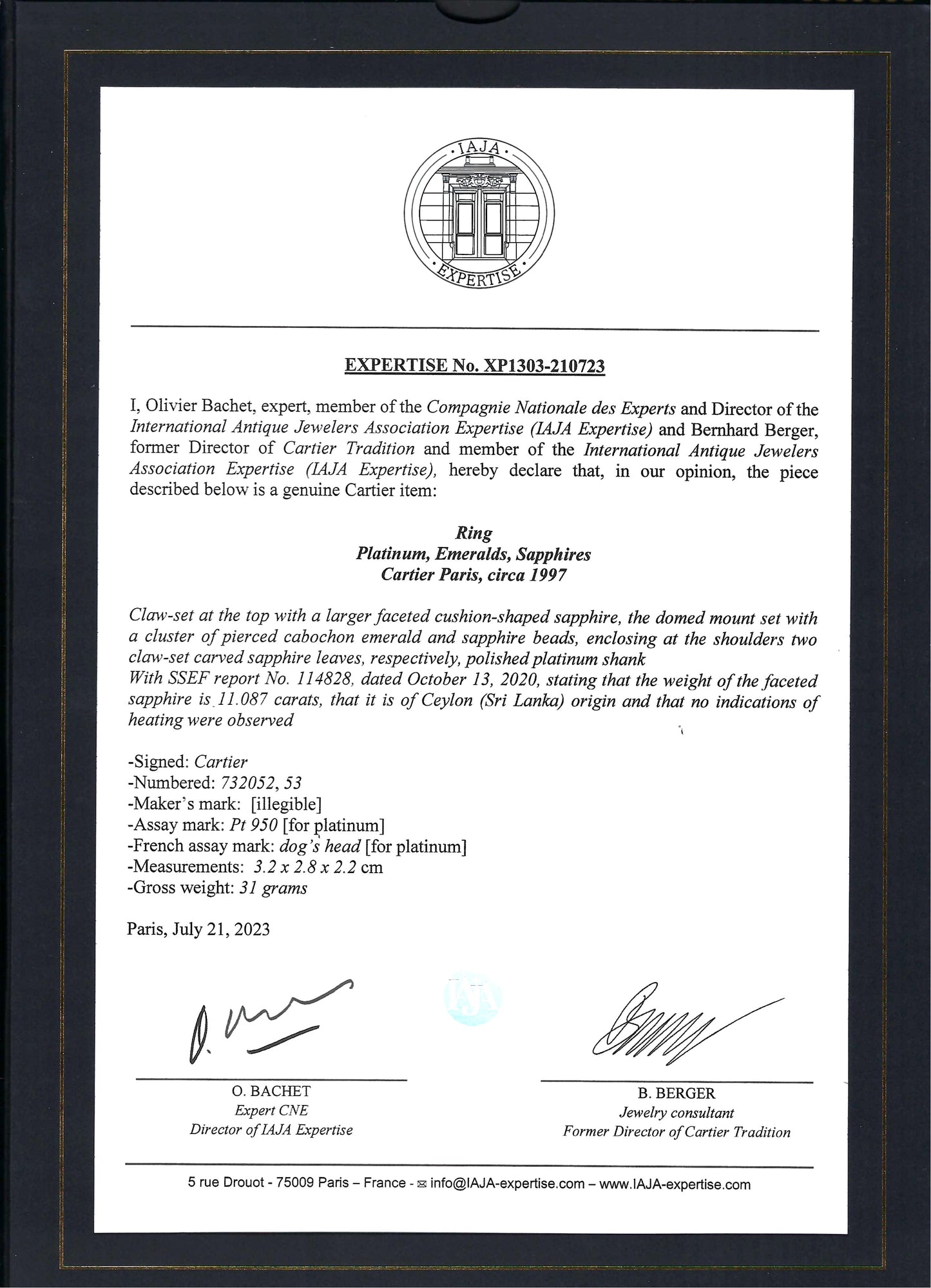 Materials: 1 cushion-shape sapphire (weighing 10.98 carats); 17 sapphire beads; 27 emerald beads; 4 carved sapphire leaves, Platinum and 18K gold