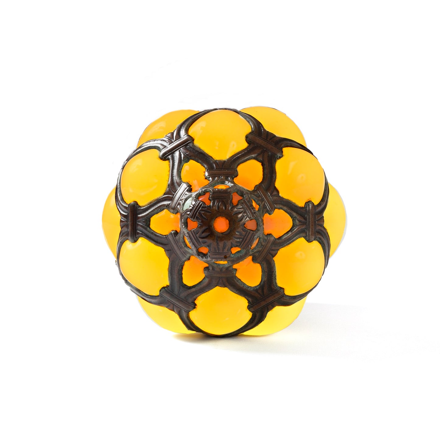 This enchanting pair of Tiffany Studios New York "hanging globe" chandeliers are composed of two reticulated glass shades. Tiffany’s idea of blowing glass through openwork bronze had evolved in the 1890s with a series of Byzantine revival fuel lamps. The technique was popularized by 19th-century Muranese Glassmakers Salvati as a derivation of the Ancient Roman cage cup (vasa diatreta). In the 4th century, Roman glassmakers encased blown glass vessels in a delicate cage of glass. In Tiffany’s version, glass is blown through an ogival pattern cage. Originating in 11th-century Byzantine textiles, the ogival pattern became established in Italy, Ottoman Turkey, North Africa, and as far west as the Balkans. We brought this pair back to its former glory with custom-made Tiffany style hanging hardware.