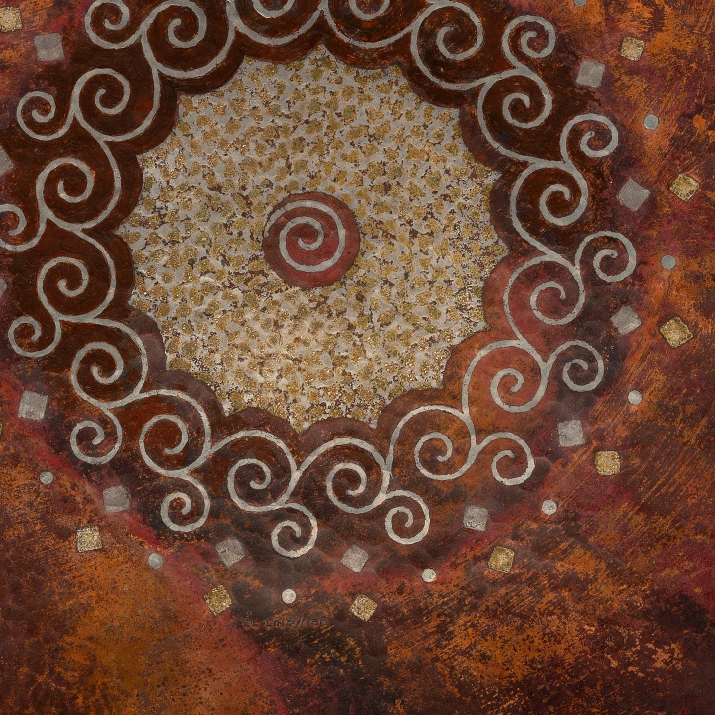 This French Art Deco Charger, by Claudius Linossier, was created using the technique known as dinanderie, which involved decorating hammering out copper vessels to produce subtle but beautiful gradations of color. The charger features concentric circles of decoration including a serpentine border, brass and silver diamonds, volute pattern, a reverse scallop medallion of pebble silver and brass inlay and a small spiral center. The decoration is composed of a radially striated caput mortuum and raw umber ground
