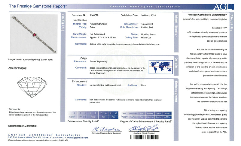 Documentation: Accompanied by American Gemological Laboratories (AGL) report no. 1146722 dated 26 March 2025 stating that the ruby is of Burma origin, with no evidence of heat treatment.