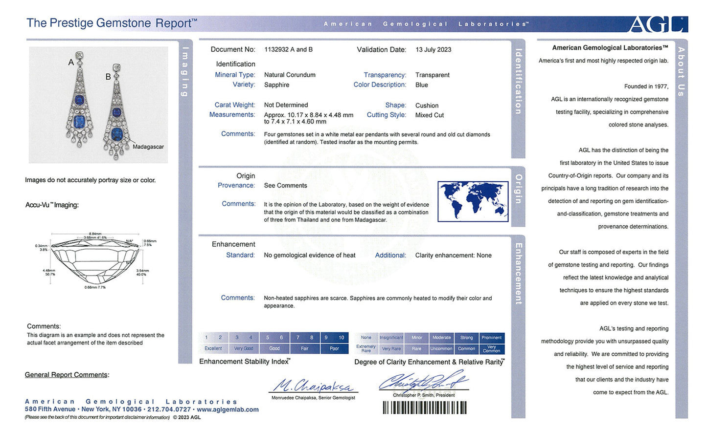 Documentation: The four sapphires are accompanied by AGL report 1132932 A and B dated 13 July 2023 stating that the sapphires weighing approximately 5.06, 1.95 and 1.90 carats are of Thailand origin, while the sapphire weighing 4.14 carats is of Madagascar origin.