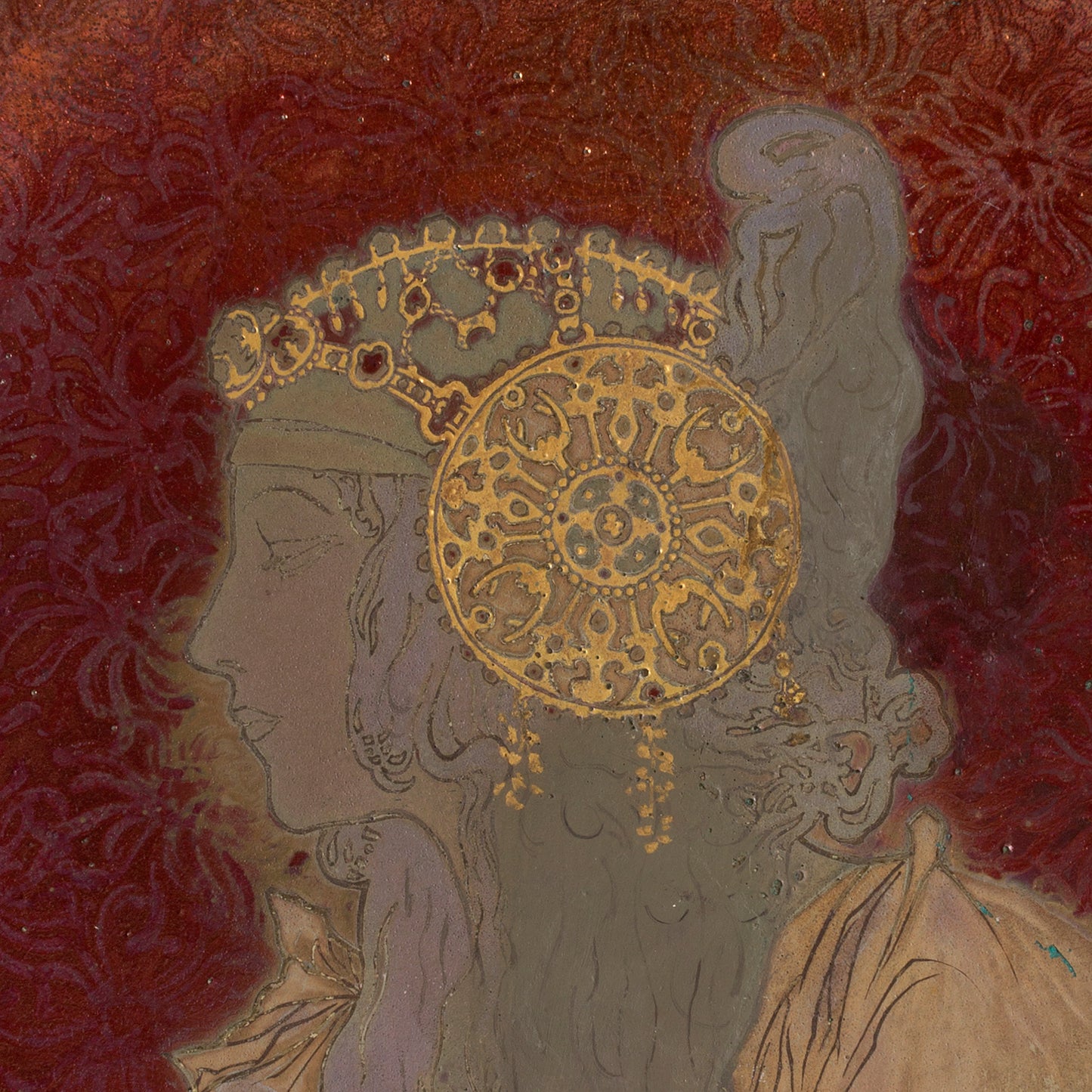 This iridescent, enamel-glazed ceramic charger by Clément Massier, modeled after a design by Alphonse Mucha, depicts a woman's profile in Byzantine dress and jewels. The subtly-colored French Art Nouveau profile on the charger, with a deep oxblood ground, focuses on the celebrated image by Mucha of a Byzantine woman with an ethereal glow, her station in the history of the beautiful, cemented by Massier's otherworldly depiction in this highly delicate enamel work that is perfect to hang anywhere in the home.
