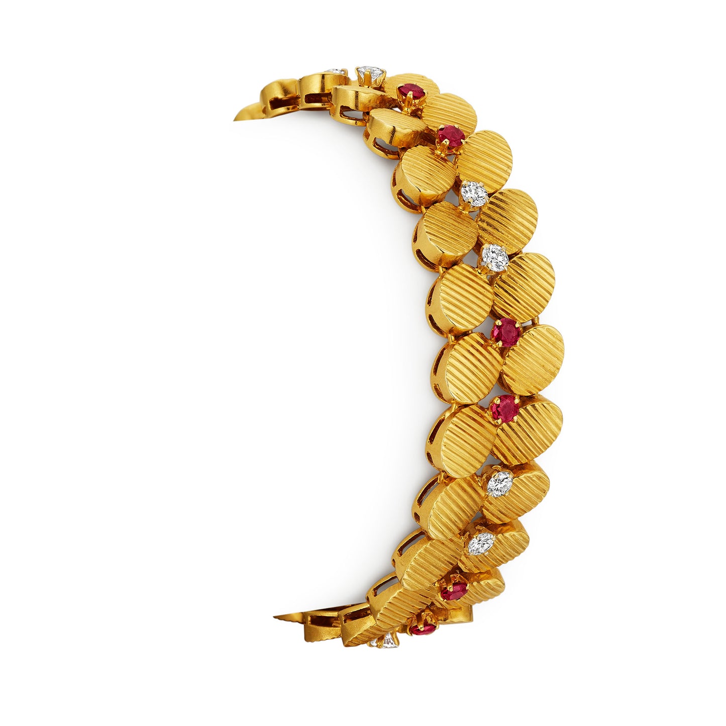 Created in the 1960s by Péry & Fils, Paris, and retailed by Gübelin, this mid-century ruby and diamond necklace and bracelet are set in 18K gold. The strap bracelet and slightly graduating necklace are both designed as ribbed, leaf-form links mounted with pairs of round brilliant-cut diamonds alternating with rubies. This suite is an example of refined mid-century jewelry - everyday, simple motifs and forms uplifted by streamlined design and exceptional Parisian workmanship.
