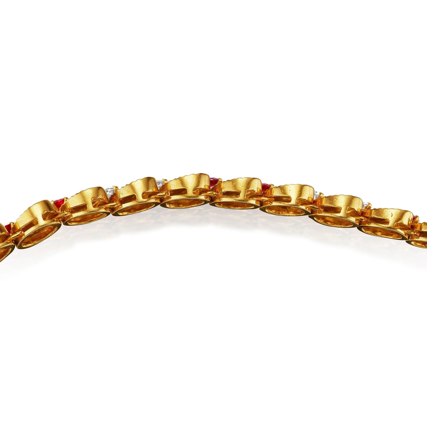 Materials: Necklace: 14 round-cut rubies (approximate total weight 1.50 carats); 12 round brilliant-cut diamond (approximate total weight 1.50 carats); Bracelet: 12 round-cut rubies (approximate total weight 0.90 carat); 13 round brilliant-cut diamond (approximate total weight 1.20 carats); 18K Gold